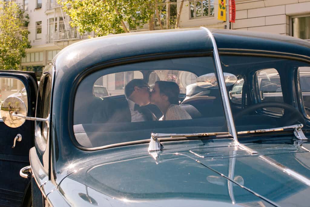April and Kelsey arranged for a shuttle to take their guests to the reception, but the newlyweds rented this killer vintage car to drive over in alone. Of course, we had to get a few photos with it before they drove off! It perfectly complemented their classic look, and it also looked really fun to drive through the streets of San Francisco.